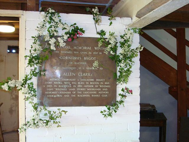ALLEN CLARKE MEMORIAL WINDMILL. This windmill was given in 1937 by Cornelius Bagot of Blackpool to be maintained as a memorial to Allen Clarke, author, journalist & Lancashire dialect story writer who was born in Bolton in 1863 & died in Blackpool in 1935 - Author of "Windmill Land", "Windmill Land Stories", "Moorlands and Memories" - Founder of the Lancashire Authors Association and the Blackpool Ramble Club.