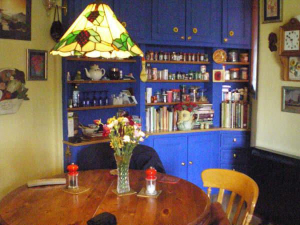 The family bathroom, with its white suite and overhead shower, pine and tiled walls, is also on the ground floor.