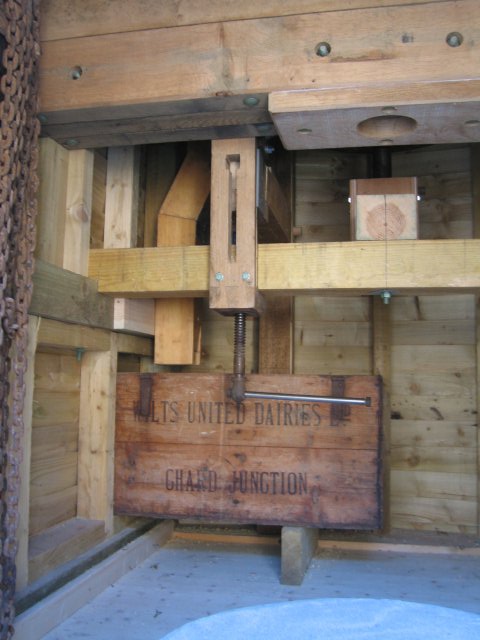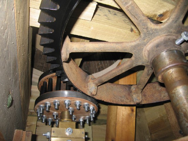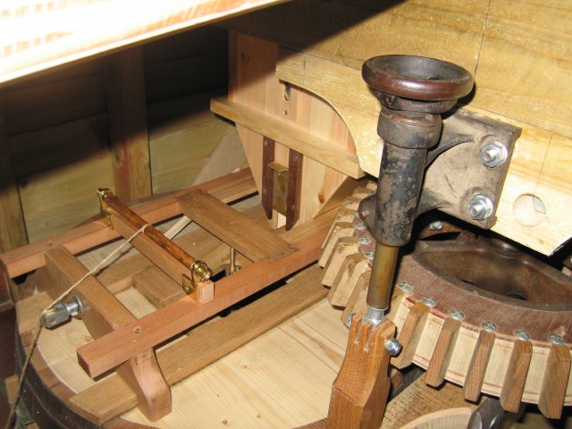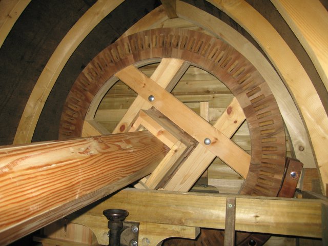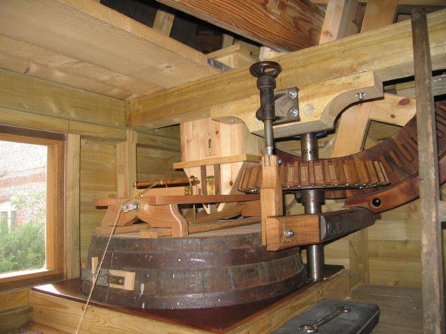 The mill is half sized, dimensionally based on the one at Pitstone, using a combination of traditional materials and, where applicable, modern technologies such as thrust bearings etc. It is capable of milling flour using a single pair of stones sourced from the late, great Fred Dibnah.