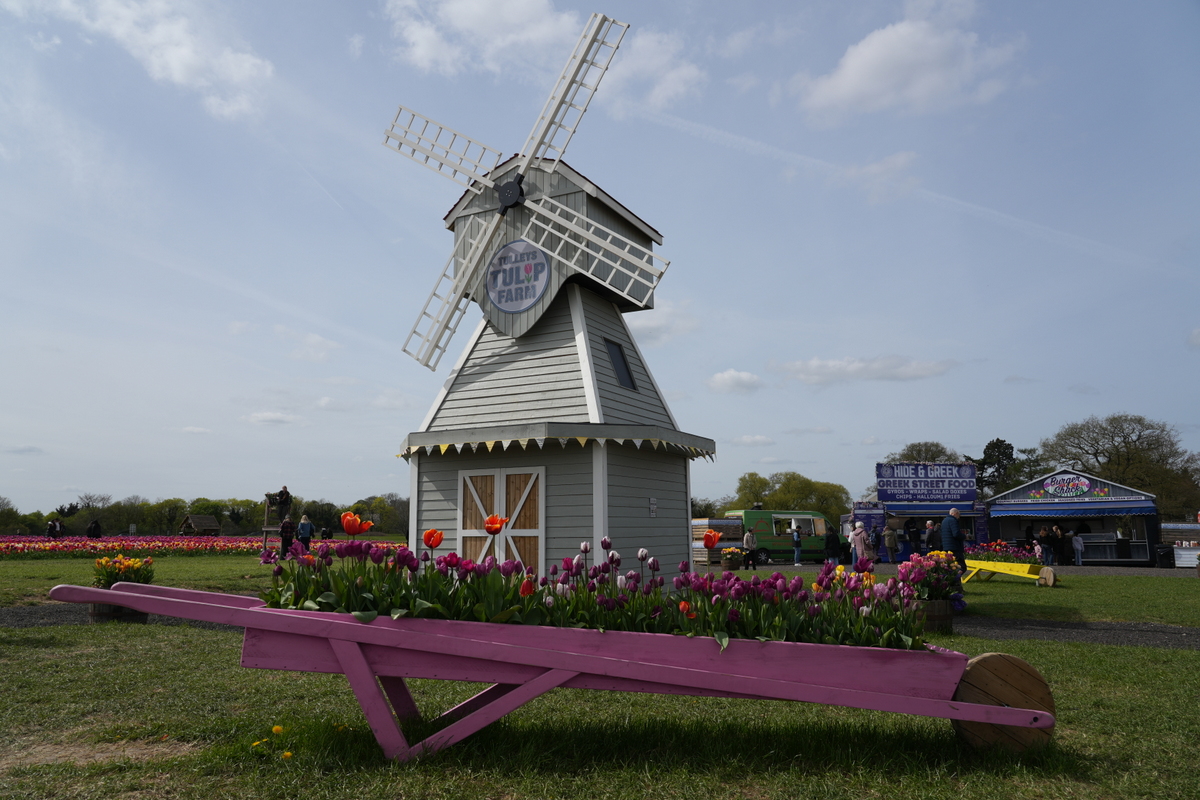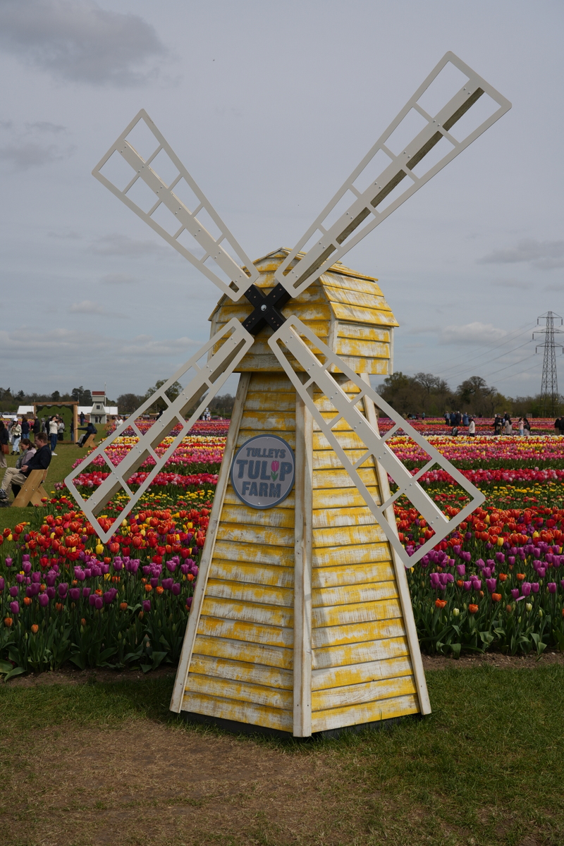 Over winter 2024/25 I was driving along the M25 near St Albans, Hertfordshire, when I noticed a set of windmill sails that hadn't been there before. On further investigation, I found that these were on a newly built mock mill, part of the Tulleys Tulip Field attraction at Willows Farm. I didn't get to visit the attraction in 2025, but now that spring is here, and the tulips are in full flower, I've visited this year.