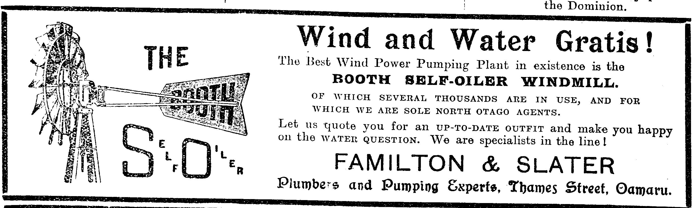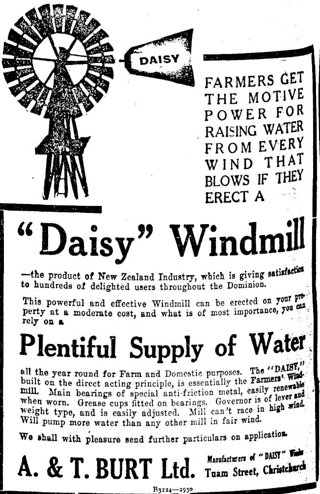 Independent Water Supply FOR FARMERS. That's what every farm should have. Depending on the rainfall is risky. On the other hand, carting water from streams is costly. The most reliable, efficient, aud economical means of securing an abundant water supply is to erect theAt the end of 1917, on taking over the selling of T. R. Clow's Daisy wind engine, the ad changed dramatically: New Zealand Herald, Volume LIV, Issue 16729, 22 December 1917