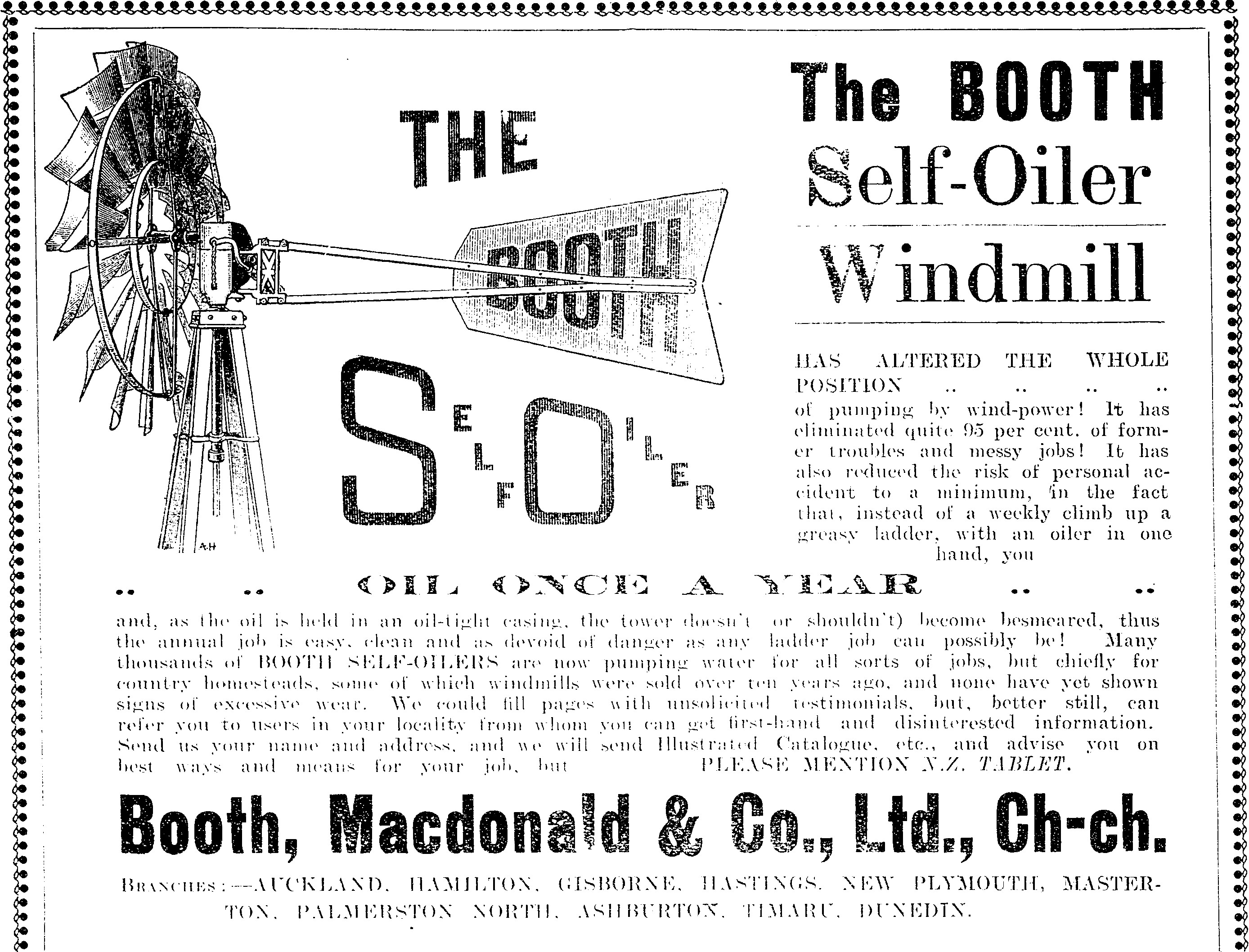 An Edina Windmill is a labor saver. It works year in and year out pumping water to satisfy the stock, irrigate the land, and supply the home. It requires a minimum of supervision - an occasional oiling and tightening of nuts being practically all the attention needed. Care is given to every detail of construction. Every separate part of the mill is made of the highest quality material, and the workmanship is unsurpassed. Brass pumps particularly suitable for windmills stocked : also all classes of piping, taps, tanks, pumps, etc. Full particulars on application. Procurable from our Agents, or direct from A. & T. Burt, Ltd., DUNEDIN, CHRISTCHURCH. WELLINGTON, AUCKLAND, AND INVERCARGILL.