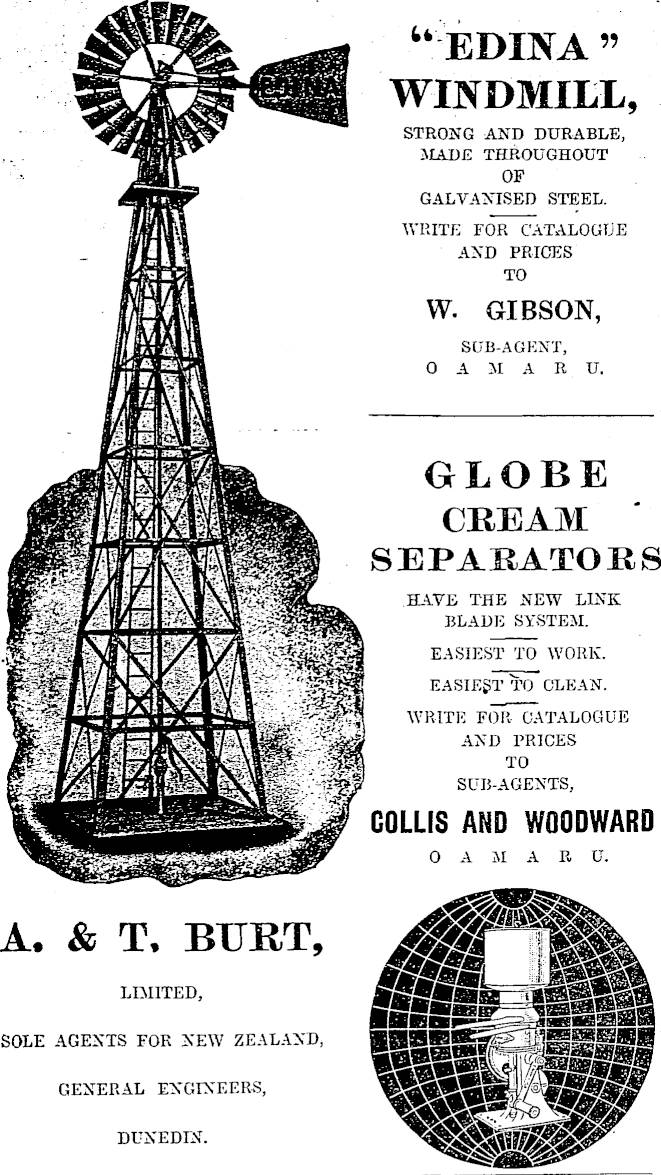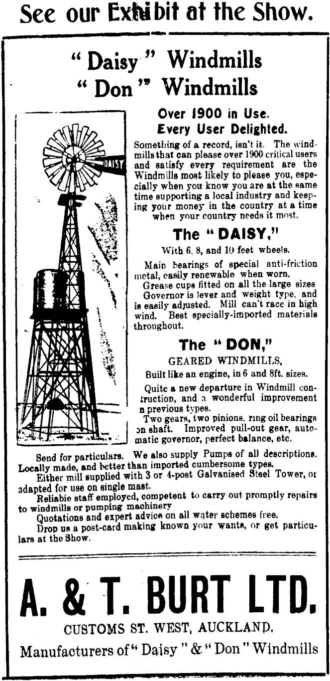 A. & T Burt were an established firm of hydraulic engineers (from at least 1891), who branched out into other engineering areas. From around 1907 they were selling the imported Edina wind engine, manufactured by the US Challenge Windmill company. Around 1917 they became the successor to T. R. Clow in manufacturing the Daisy and Don wind engines in Auckland, but had other locations at