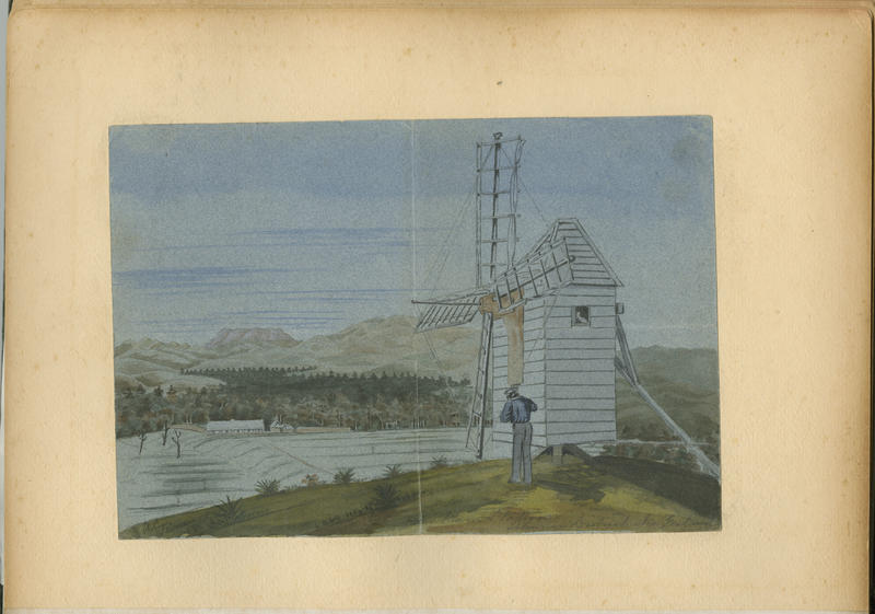 The brothers Alfred and Frederick Chapman settled on Edenham Station, Hawkes Bay in the 1850's. Their sketch and watercolour album includes scenes from around the station, showing the windmill that they built, a small open trestle post mill with bowsprit stayed sails and a high mounted tailpole. The close-up image of the mill shows it on a hilltop above the farm, as does one of the other images looking from the cottage up to the hillside above. However, other images in the album, including one titled "Alfred's first house", shows a mill on the flat land surrounding the house, so I assume that this was probably an earlier incarnation of the same mill, which was later moved to be better located.