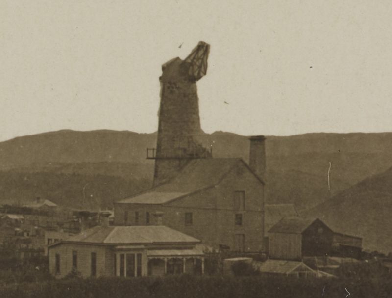 The windmill erected by Mr Hassell three years ago is the most conspicuous, being situated at the top of the hill, and rearing its gaunt proportions against the sky far above the town. When the tower was being built a new comer asked "What in the name of fortune is that?" "Oh," was the reply, "Long S---- has recently come to Oamaru, and they could not find a house tall enough for him, so that is being built for him." Although called a windmill, it is really a windmill assisted by steam; or, perhaps, rather, a steam mill assisted by wind. So uncertain is the latter source of power that it cannot be said to do more than a fourth of the work. It consists of a tower of Oamaru stone, 64 feet high, with a cap which adds ten feet to the height of the whole structure. It is in eight floors, and has a three-story wooden building attached. It is what is termed a tower mill, and the machinery is all of the best description, by Whitmore and Sons, with silk dressers, and all the usual appliances for producing first-class flour. I am sorry the space at my disposal prevents a more complete description of the mill, which has a producing power of about 1500 tons per annum. A steam engine of 16 horse-power works the stones when there is not sufficient wind, and the water for this is forced from the creek about 150 feet below by a No. 7 hydraulic ram.