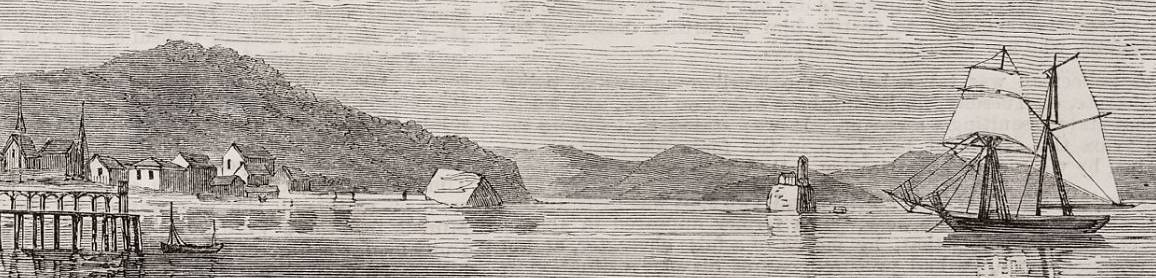 Every ridge, every crescent, beach, every rock, has its story. Down below is a curious islet which in itself is a story land in miniature. It is that little rocky island at the far end of Russell beach, locally called Mill Island. In the early days, when the isle was somewhat larger, a windmill for grinding flour from the Maori-grown wheat stood on its flat top, fifty or sixty feet above the water. On the charts the rock is called Observatory Island, a name given when the survey of this coast was made by the officers of H.M.S. Acheron, in 1849-50. The Maori name is Kairaro. One of the ship's guns used in the defence of Kororareka against the Maoris in 1845 was used as an anchor to guy down one of the stays that supported the windmill on its precarious perch.