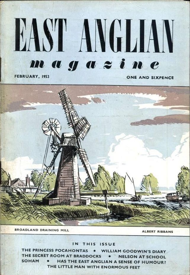 East Anglian Magazine cover showing an unnamed Broadland drainage smock mill, possibly St Olave's, issue February 1953