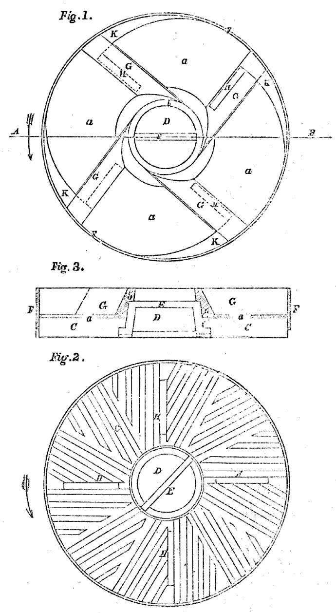 Fig. 1 is a top view of the upper of a pair of millstones; fig. 2 is an under view thereof; and fig. 3 a vertical section on the line A B of fig. 1. C is the millstone, D the eyehole, and E the cross. F is an iron case, which encircles the millstone, and rises above it to the height shown in the vertical section, fig. 3: it is open at top, but has a solid bottom, a, which rests on the top of the millstone, and a collar, b, by which it is attached to the cross E, so that it may revolve along with the stone. G G G G are four radial vanes, which extend from the collar b to the inner circumference of the upper part of the case, and are inclined forwards in the direction in which the millstone revolves. H H H H are four openings made through the bottom, a, of the case and the stone beneath, immediately before the vanes G G G G, for the admission of the air between the grinding surfaces. As the stone and case revolve, the air is driven down through these apertures by the resistance it meets with from the vanes. KKKK are guide plates, for the purpose of directing or inclining the air into the openings H H H H. The inventor declares that he does not restrict himself to any number of vanes or openings in the stones and case, nor to any particular shape to be given to the same; but that these may, consistently with the principle of his invention, be of any convenient number or form.